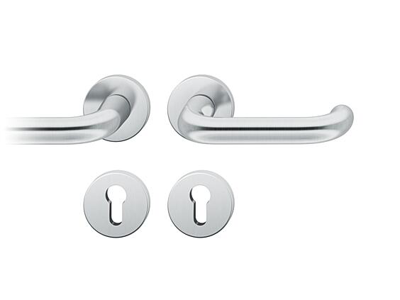 Komplet drzwiowy klamka-klamka, rozetki okrągłe pod klamkę, rozetki okrągłe pod klucz, trzpień 8 mm, grubość drzwi 39-58 mm.